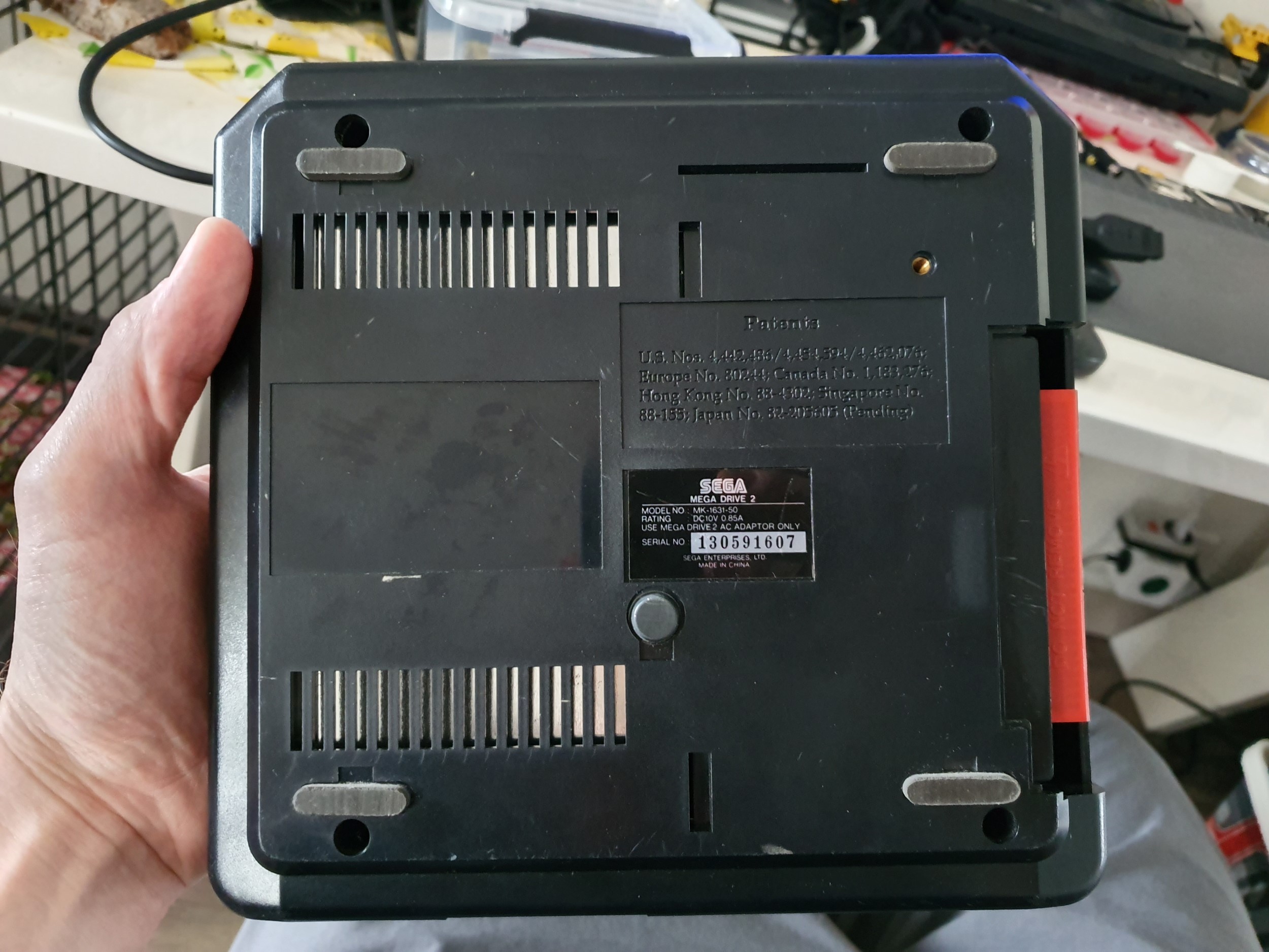 Voici la seconde Mega Drive 2 provenant du Colis du 07/09/2019. Elle est en bon état extérieur mais il manque le cache du port d’extension, c’est dommage !